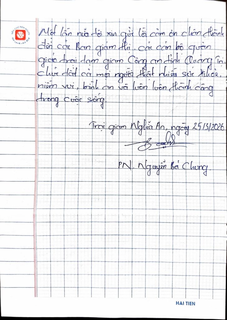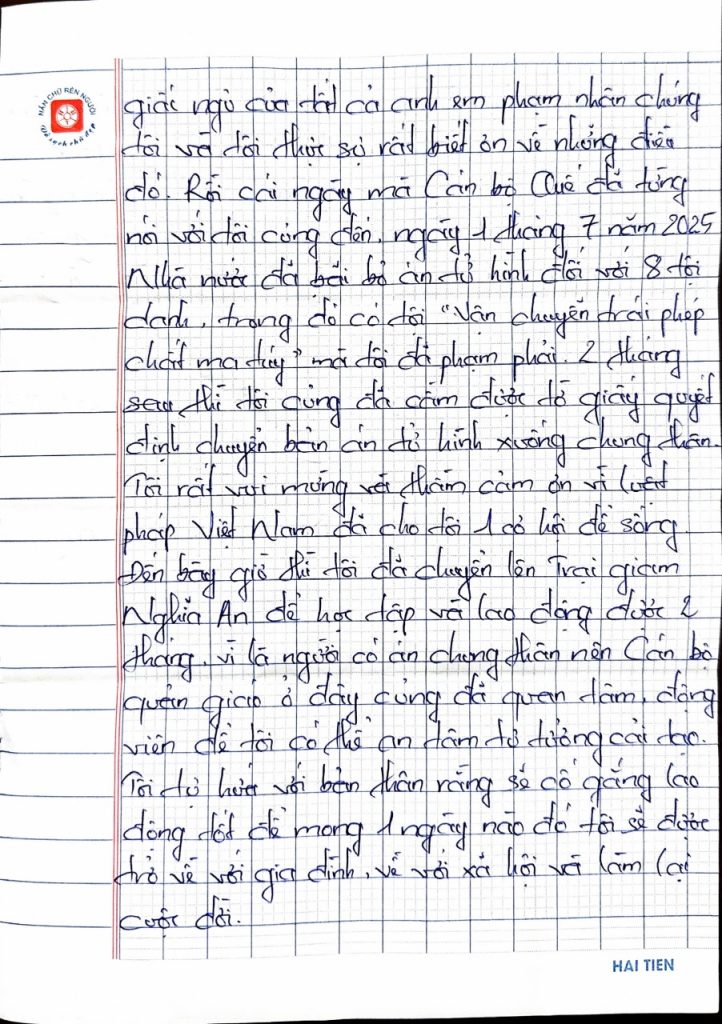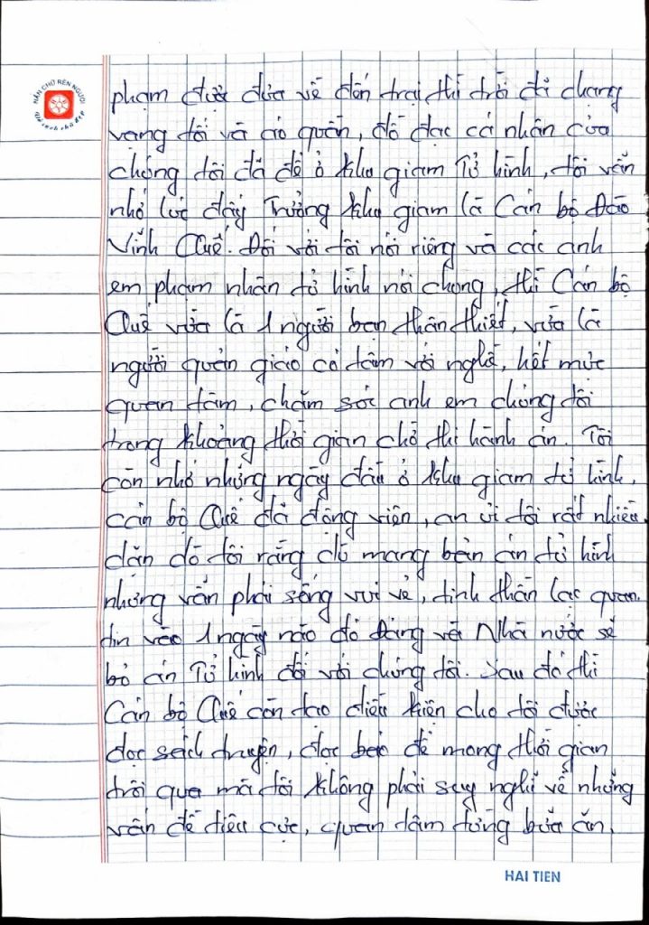 Trong lá thư tay giản dị, không lời lẽ cầu kỳ, từng dòng chữ chất chứa sự chân thành và xúc động. Phạm nhân chia sẻ rằng, trong quãng thời gian tăm tối nhất của cuộc đời, chính sự quan tâm, động viên và cách ứng xử đầy tình người của cán bộ quản giáo tại Trại tạm giam số 1 đã giúp họ dần thay đổi nhận thức, biết nhìn lại lỗi lầm và nuôi dưỡng hy vọng được sống để cải tạo, làm lại cuộc đời. Lá thư không dài, nhưng đủ để lan tỏa một thông điệp sâu sắc: phía sau sự nghiêm khắc là trái tim ấm áp; phía sau kỷ luật là tình người. Đó không chỉ là minh chứng cho tinh thần trách nhiệm, mà còn là biểu hiện rõ nét của giá trị nhân văn trong công tác quản lý, giáo dục người bị tạm giữ, tạm giam.